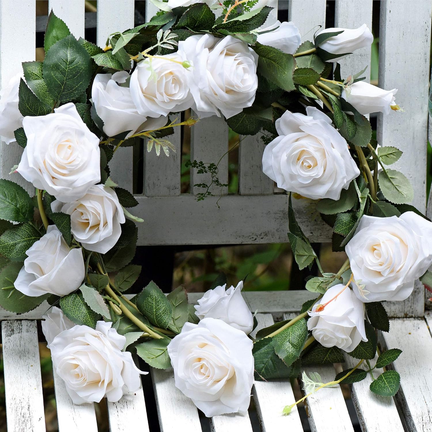 - With FiveSeasonStuff's bendable silk artificial rose white flower garlands, you can create a gorgeous and beautiful area. Consisting of 10 rose heads in various bloom cycles, each lifelike garland is natural looking. Each artificial rose vine is made up of 4 large full flowers, 4 medium sized flowers and 2 rose buds. Rich petal layers, new shoots and detailed leaf textures make these rose garlands so realistic.