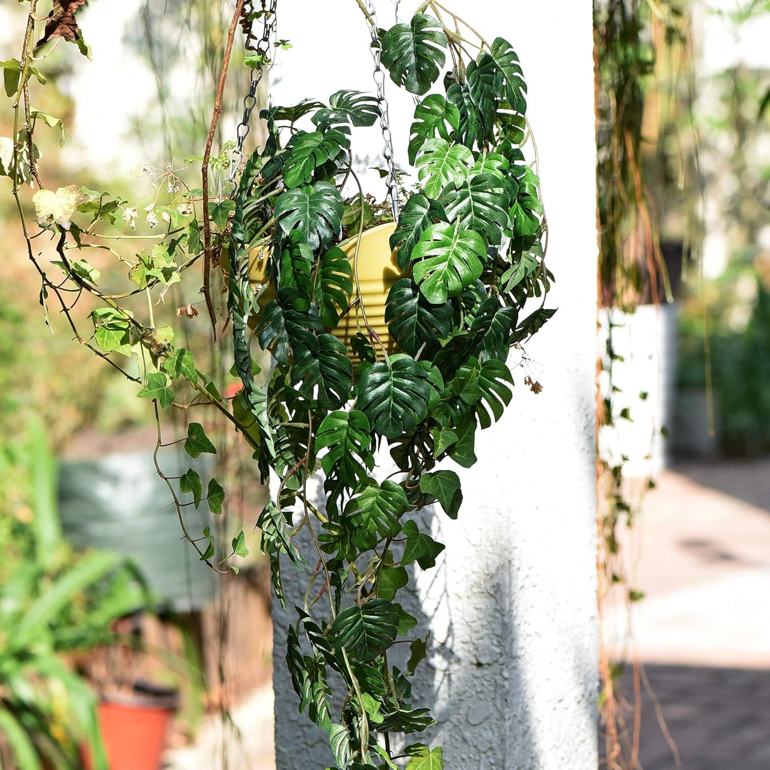 - Monstera vine garlands are suitable as outdoor face monstera plant decor leaf garlands for hanging on walls, doors, trellises, mirrors, fences, gates, covering unsightly areas, sheds, swing frames, air conditioning pipes, water pipes, exposed wires, balconies, patios, fireplaces, windows, porches, archways, pergolas, gazebos. And as artificial green indoor garlands for flower curtain rods, handrails, stair railings, stair decoration, railings, fireplace mantel garlands.