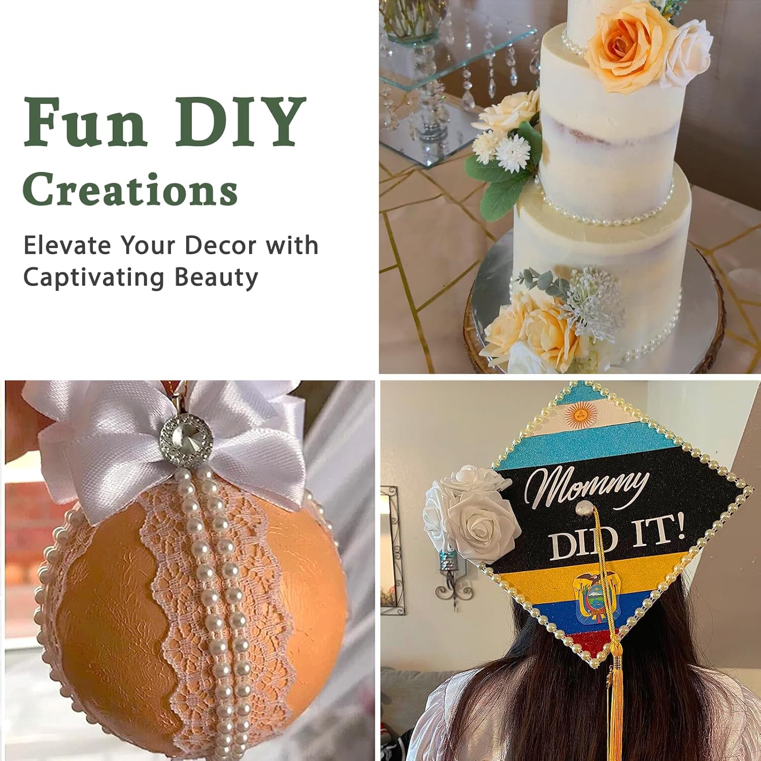 - Faux pearl garland: Add the elegance of faux pearls to your decorations, and add luster and charm to your handicrafts with this white beaded garland