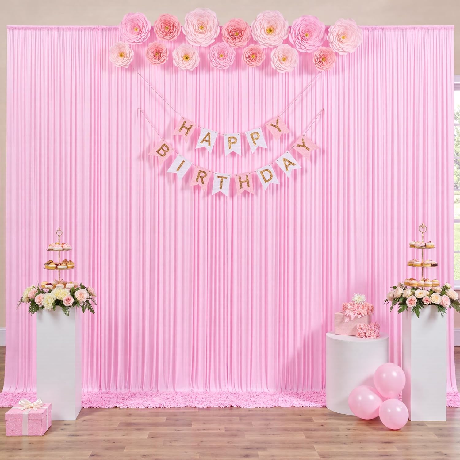- Baby Shower Pink Curtain Drapes Make Your Party Pops๏ผYou can add some flowers,greenery,balloons, party streamers, fun banners, balloon arch, butterflies, paper stars, tissue paper flower prop, confetti,twinkle lights to make your polyester backdrop for a gorgeous look! Light Pink backdrop stand drapes for wedding can be hand wash or machine wash.