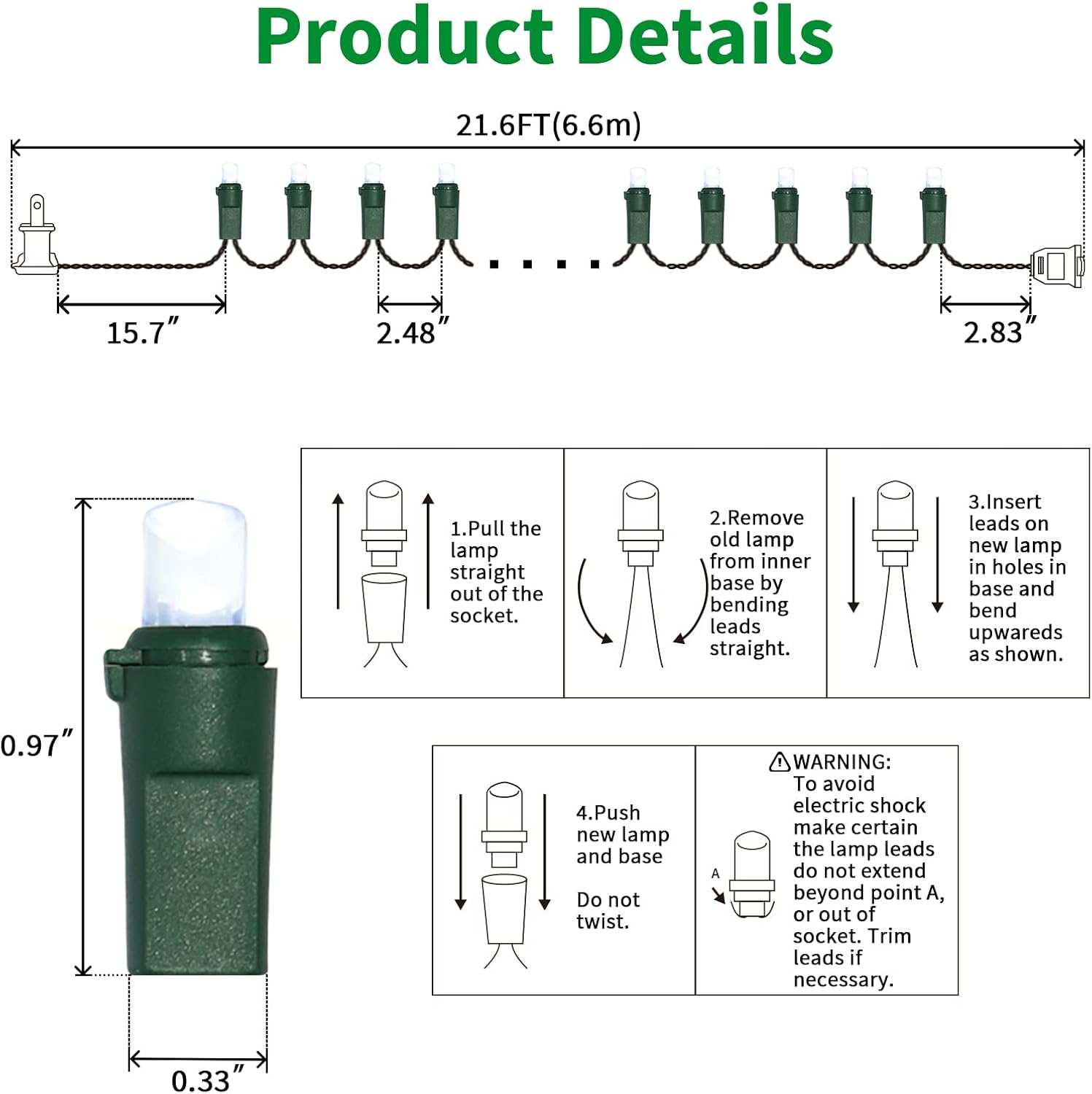 - 5mm LED Christmas Lights: 100 counts warm white 5mm wide angle stable LED string lights spaced 6.3 inches apart with green wire. 7.1 inch leads have a stackable male plug and 5.9 inch tails have a female plug for easy end to end connection.