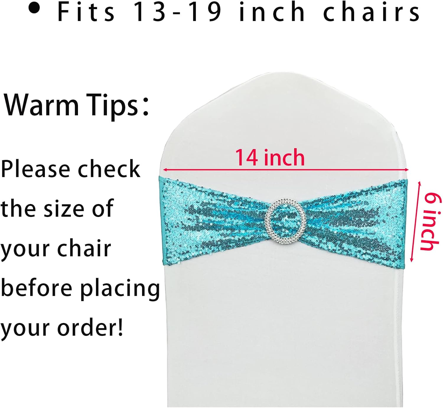 - Size: 14" x 6". Fit Width of chair: 13" - 19". High quality spandex with good elastic could stretch to fit almost all chairs. Please move the buckle to the sequin side before use.
