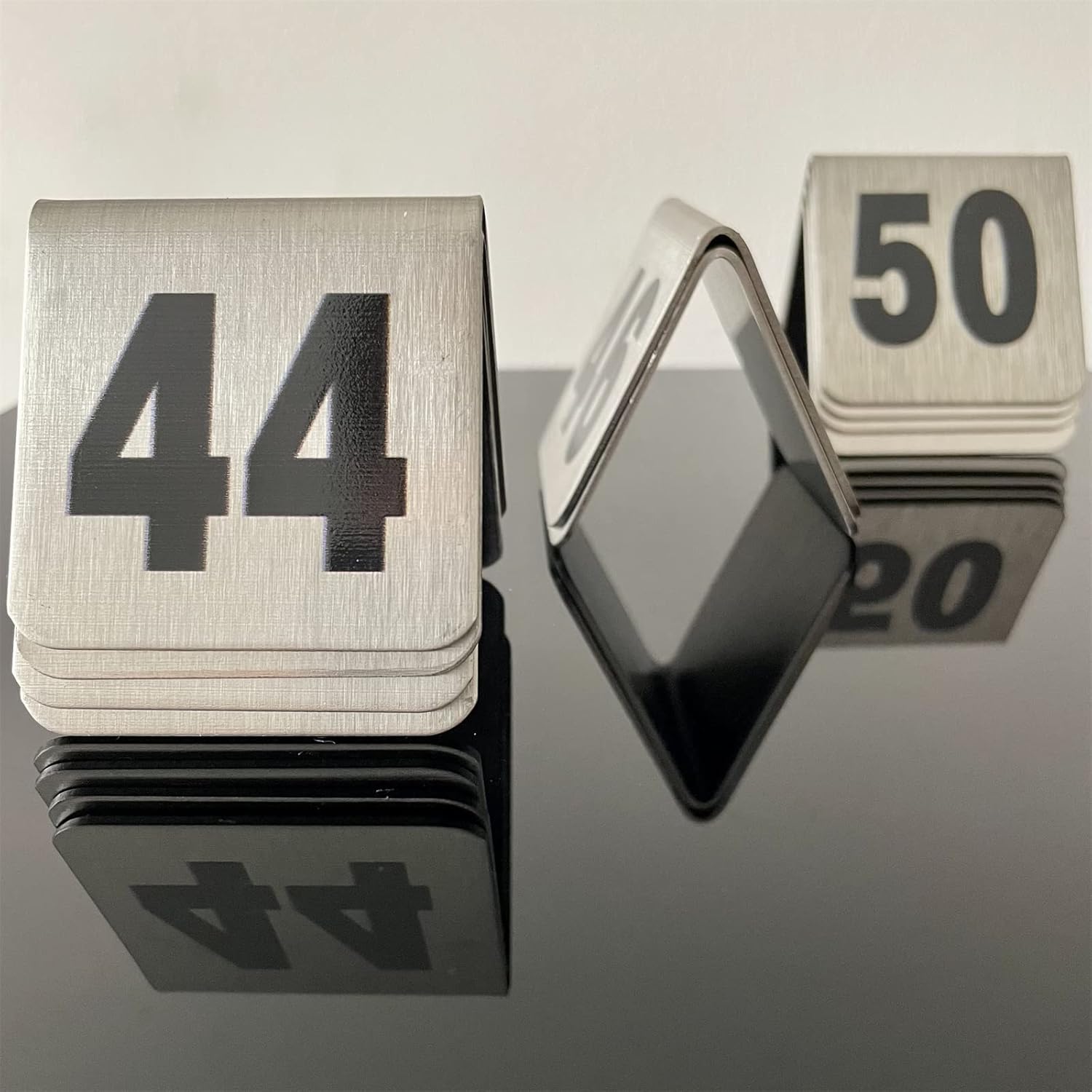 - The tent-style design makes the place cards more stable, easy storage.The double-sided numbers are easy to find, and the stainless steel material is hard to damage,never rust.Maintenance is simple, wash with water or wipe with cloth.