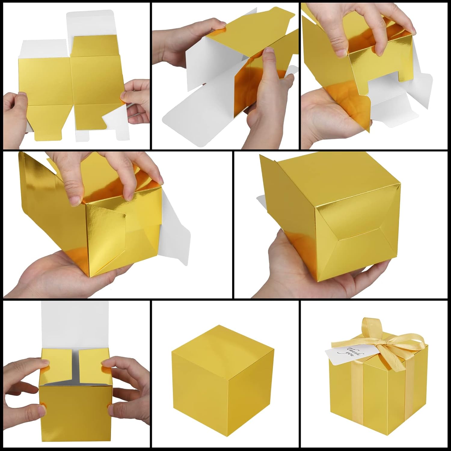 - Size Information: Candy box size is 4x4x4 inch Inches,cube shape, It is already equipped with ribbon and blank tag to complete the outside classy gift looks. Gold favor boxes are applicable to store candies, chocolates, cookies, cupcake, mugs, shot glasses, candles, bath bombs, soaps, perfumes, makeup, jewelry, or other small gift.