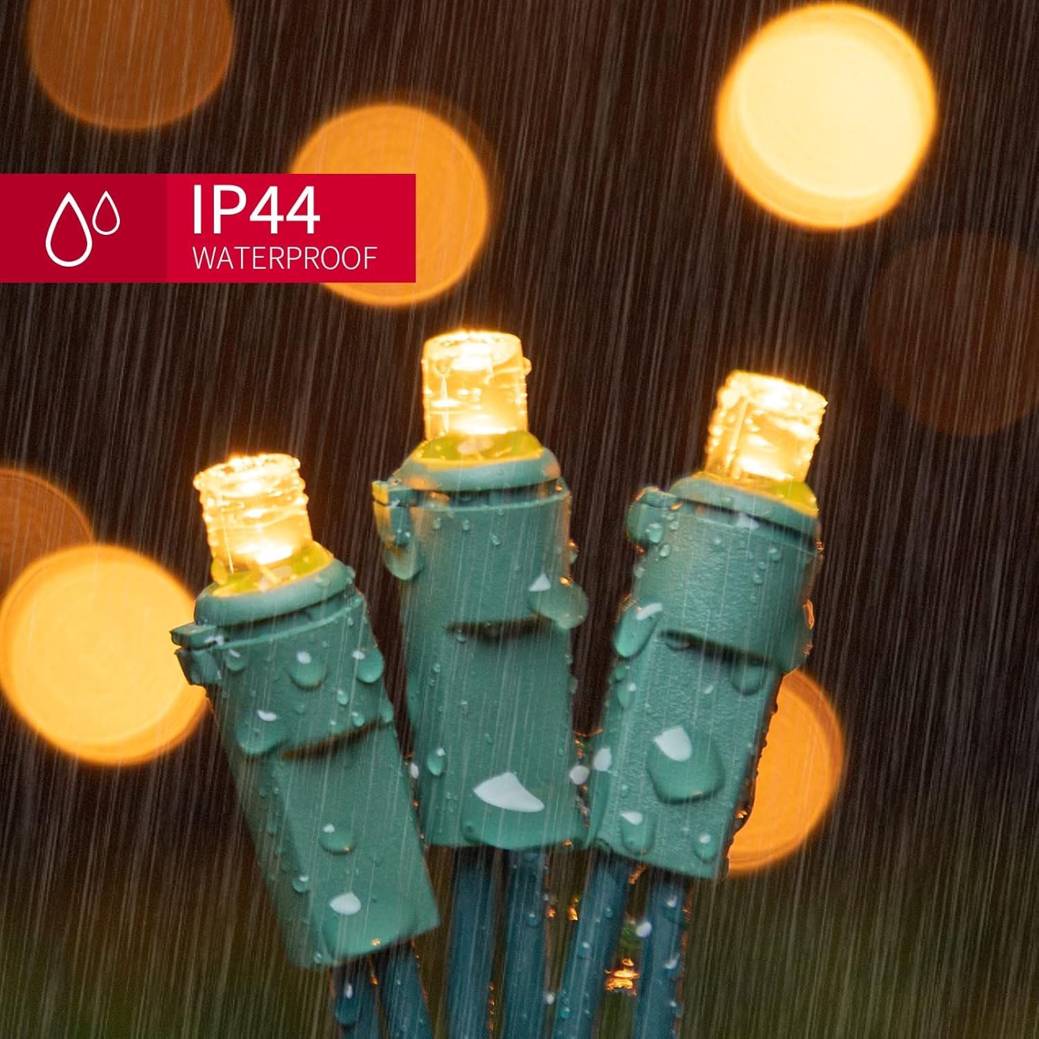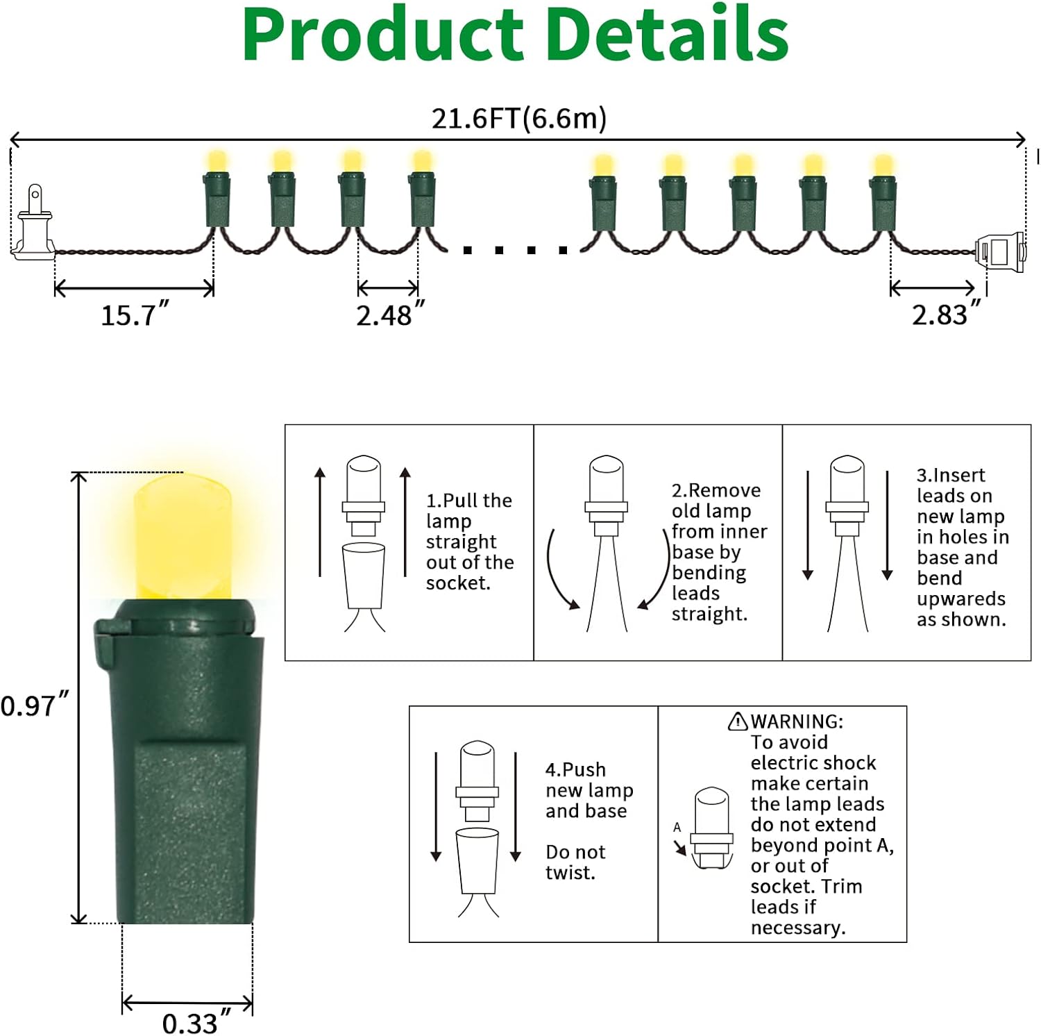 - 5mm LED Christmas Lights: 100 counts warm white 5mm wide angle stable LED string lights spaced 6.3 inches apart with green wire. 7.1 inch leads have a stackable male plug and 5.9 inch tails have a female plug for easy end to end connection.