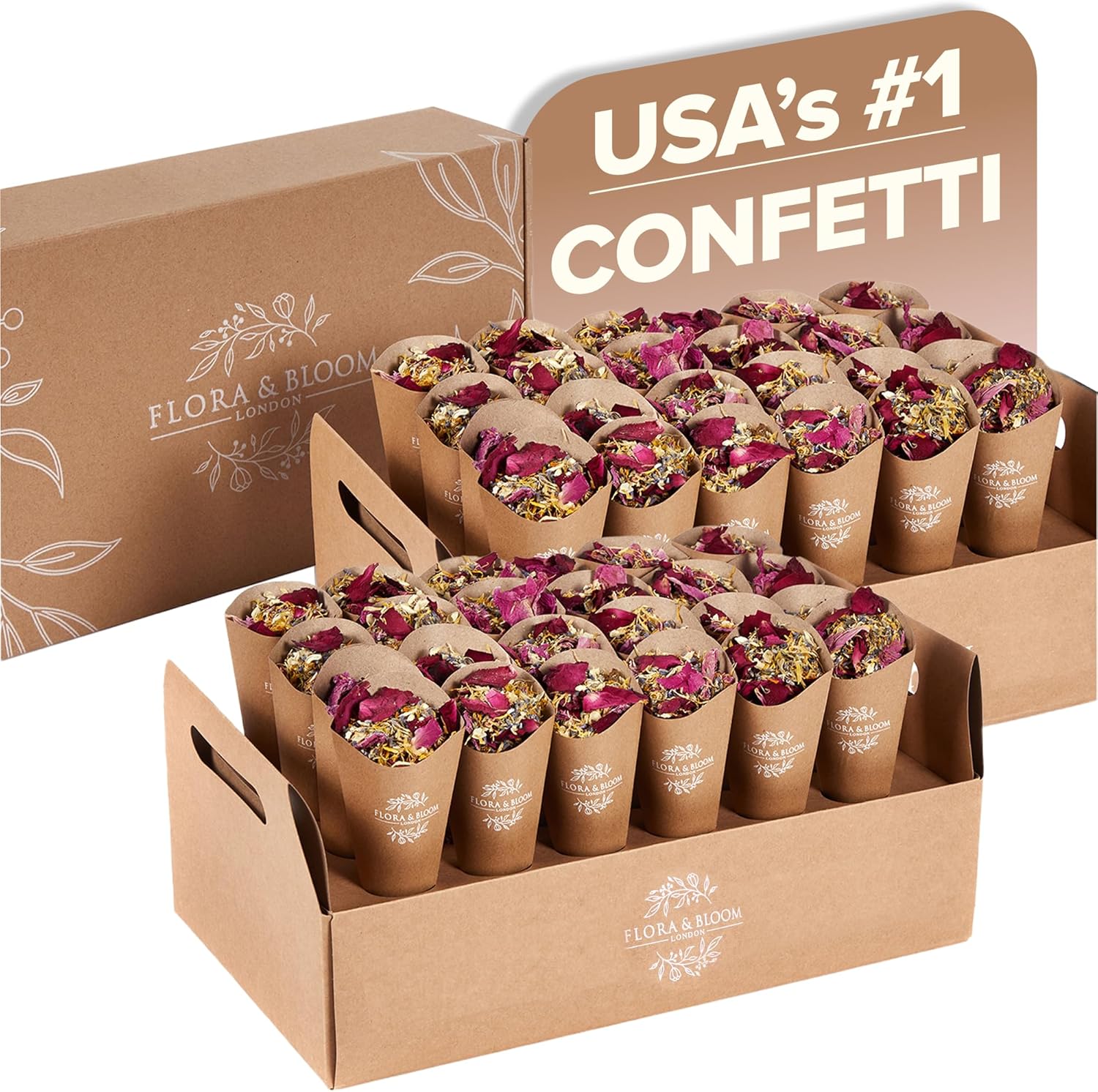 Flora & Bloom Biodegradable Confetti With Pre Built Cones | Dried Flowers (6 Litres) | Wedding Confetti Kit | Pop Open Cones & Tray |Jasmine, Lavender & Rose Petals | Wedding Decorations (48 Guests)