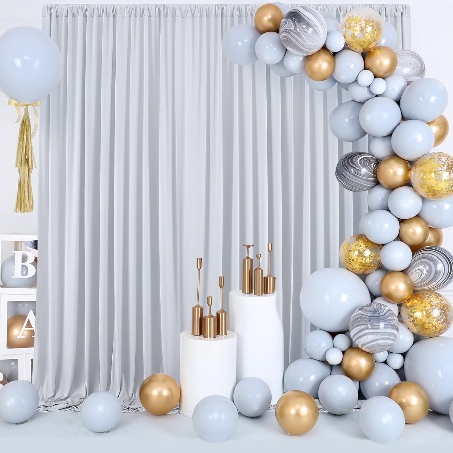 - Large Silver Photo Backdrop is Suitable Various Occassions: Our polyester drapes are perfect for kinds of accassions. Such as theme parties, wedding, baby shower, birthday party, photography, bridal shower, gender reveal, princess party, engagement party, baptism, candy buffets, dessert table, sweet table, background, photo booths, photoshoot, ceremony, anniversary, graduation, home decorations, holiday party, stage curtain and more.
