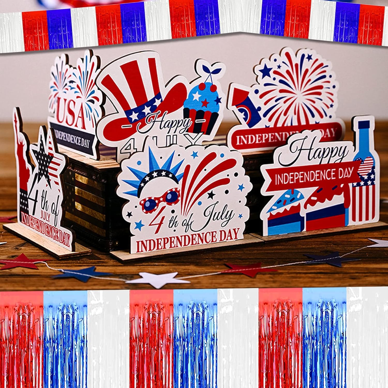 10 Pack 10 Feet Foil Fringe Garland Metallic Tinsel Streamers Banner Wall Hanging Backdrop for Parade Floats, Bachelorette, Wedding, Birthday, Independence Day Party Decorations(Red Blue White)