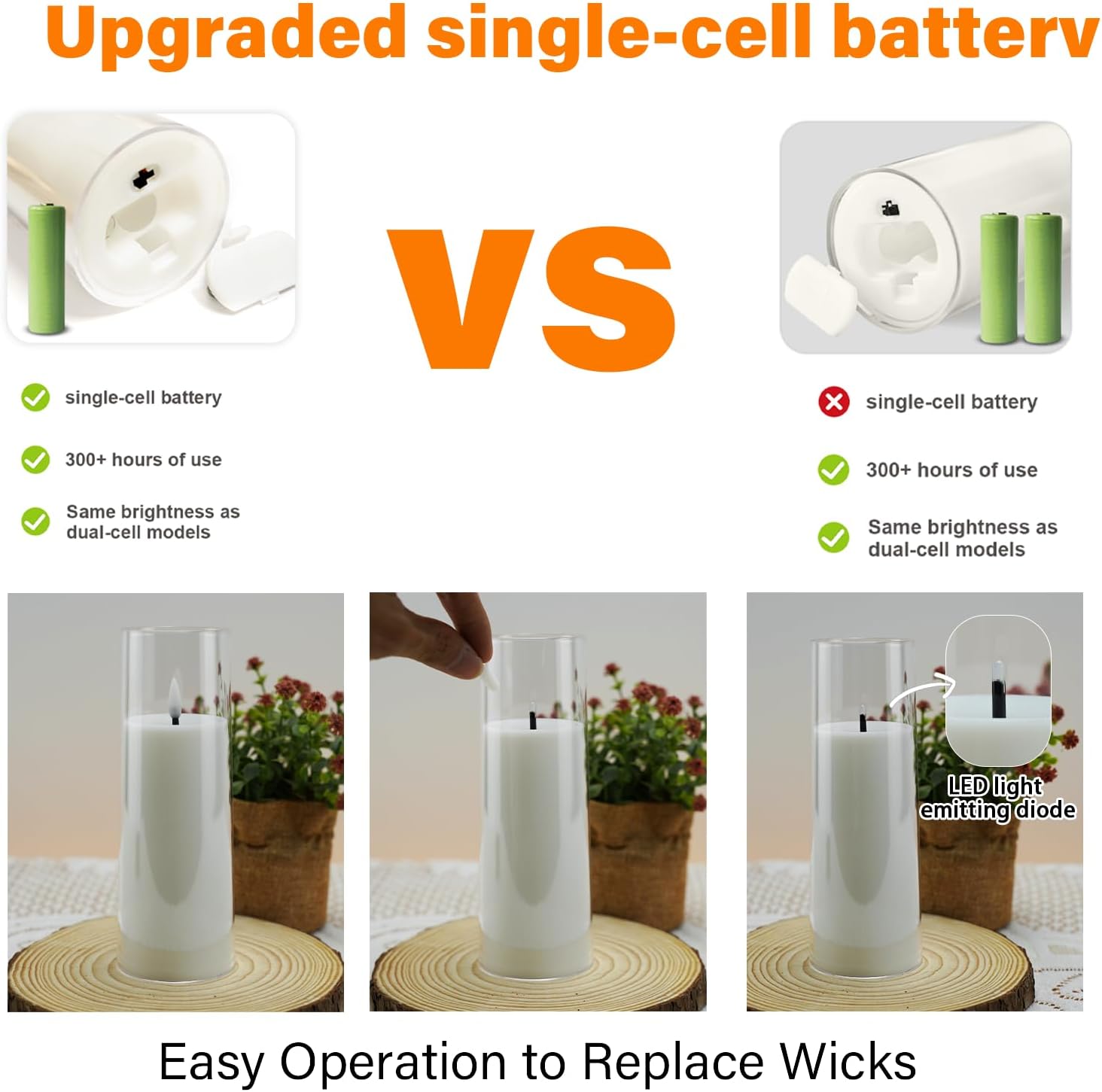 - UPGRADED VERSION - SINGLE BATTERY:Introducing our flameless candles with an advanced battery technology that lasts over 300 hours on just one single battery! That's right, unlike other brands that require two batteries, our candles are powered by only one battery without compromising on brightness. Not only is this energy-saving feature practical and convenient, but it also makes our candles a cost-effective choice.Per battery candle is powered by 1 x AA batteries (Not included).