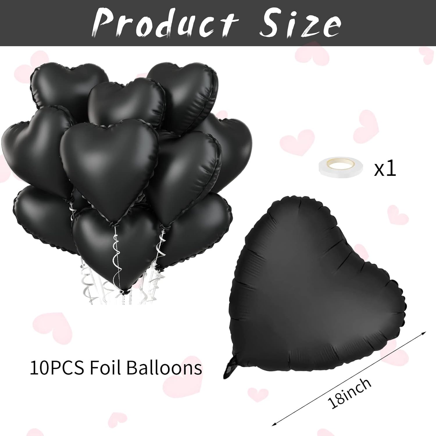 - π 10 PCS BLACK FOIL HEART BALLOONS: Package contains 10 x 18 inch black heart balloons, 1 x 10m ribbon.The black heart shape balloons are specially shaped, the perfect size for your holiday or party decorating needs, together create a fun and surprising party, leave an unforgettable smile!