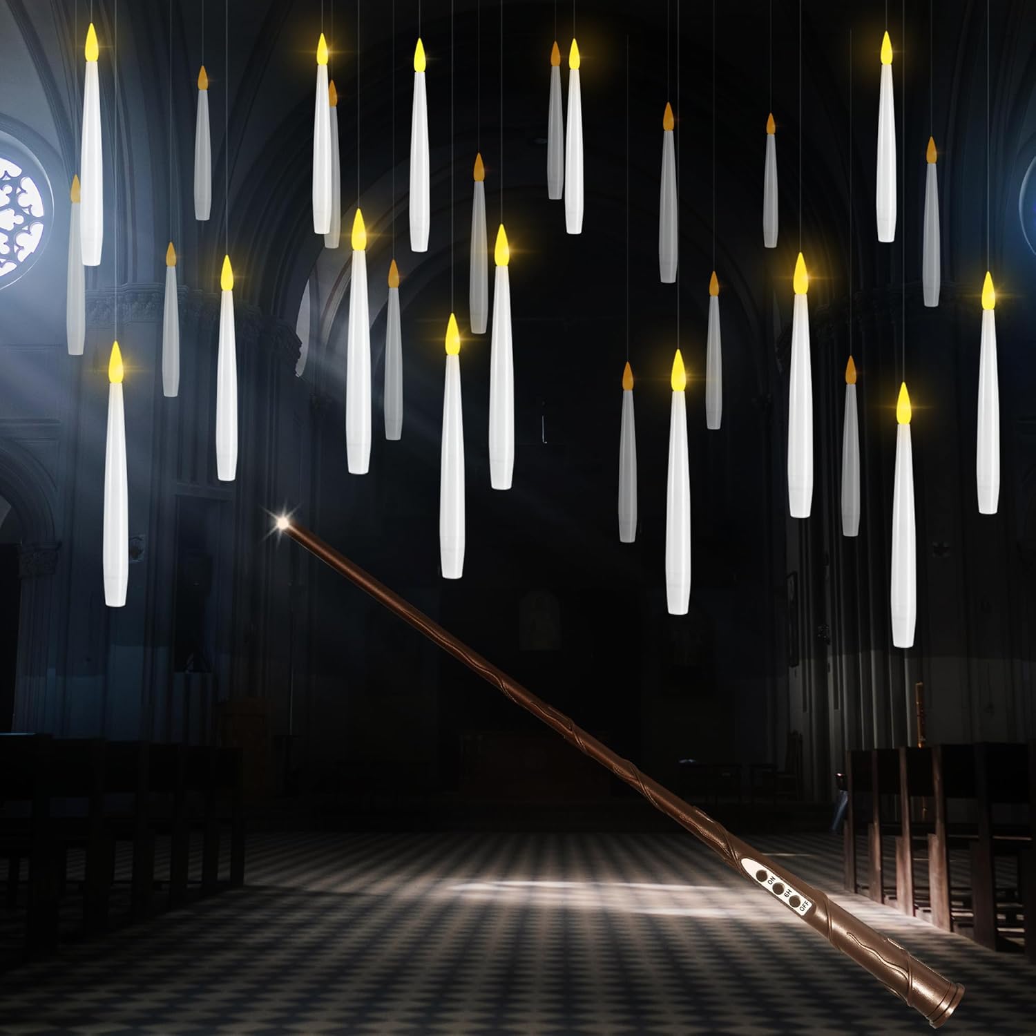 - LONG PRESS "ON" FOR 1-3 SECONDS FOR FLICKERING EFFECT🔮FLOATING CANDLES WITH WAND🔮 Start your magical journey with a cool magic wand remote! It can switch all the flickering flamless candles ON and OFF simultaneously just like magic. Your magic wand remote requires only 1x AAA battery before use(not included). By one click, you can magically light up your floating candles hanging in the air and long press ON, you can change the candles light to flicker effect just like real candles do.
