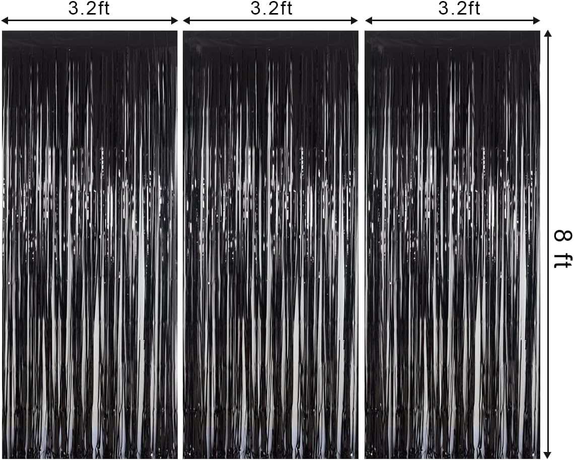 Foil Fringe Curtains Halloween Decor Party Decorations - Melsan 3 Pack 3.2 x 8.2 ft Tinsel Curtain Party Photo Backdrop for Birthday Party Baby Shower or Graduation Decorations (Pure Black)