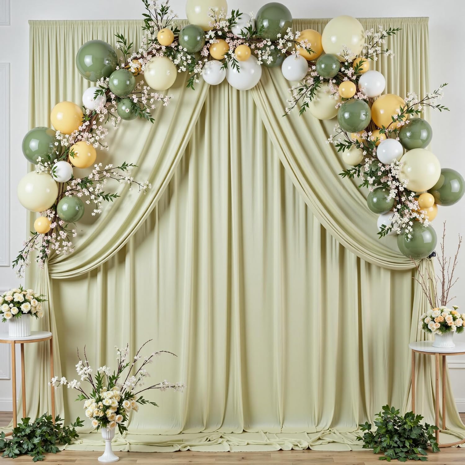 - Mint Green Backdrop Curtains Make Your Party Pops:You can add some flowers,greenery,balloons, party streamers, fun banners, balloon arch, butterflies, paper stars, tissue paper flower prop, confetti,twinkle lights to make your polyester backdrop for a gorgeous look! Sage Green backdrop stand drapes for wedding can be hand wash or machine wash.