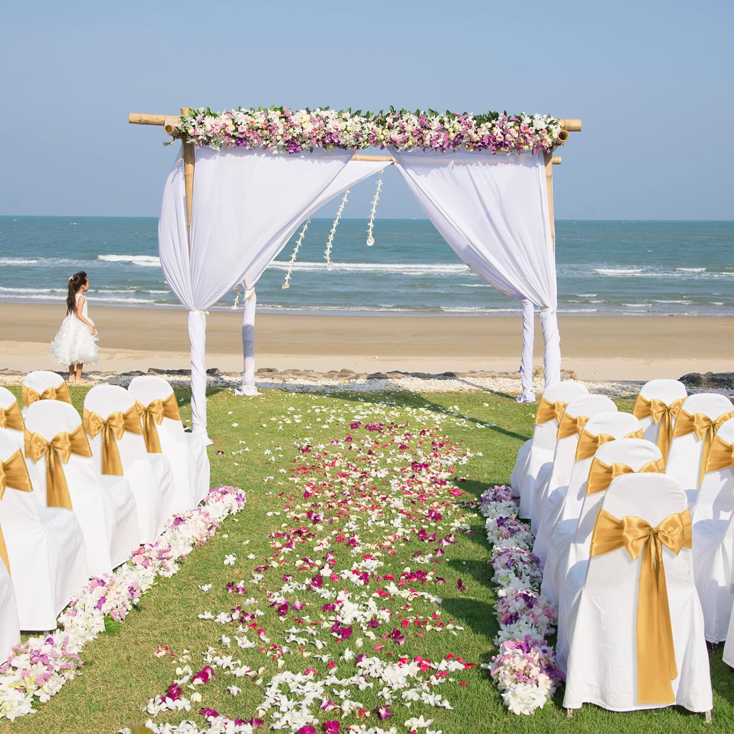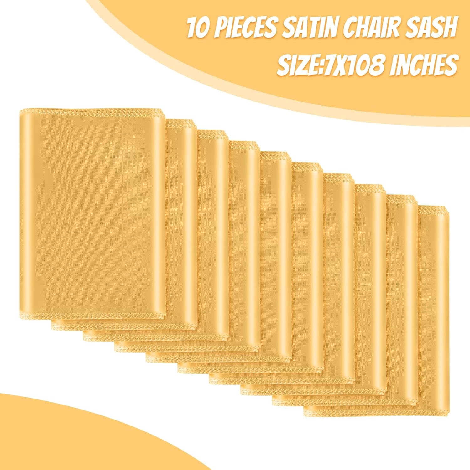 - Size & Package:You will get 10 pieces gold satin chair sashes, and the size is about 108" x7" or 275cm(l) x 17cm(w). These chair ties adopt flating packing, please to tie the bow by yourself. Each package includes chair sashes only, no chair covers