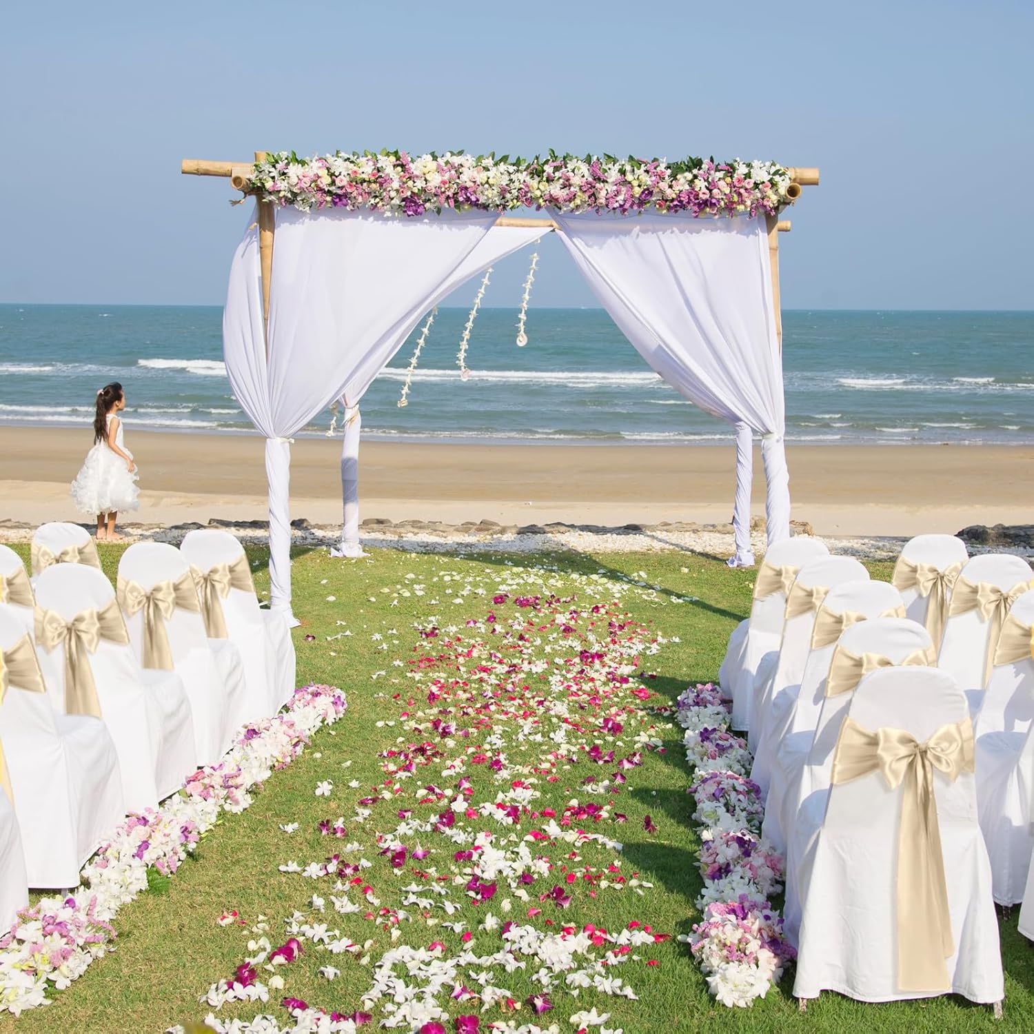 - Size & Package:You will get 10 pieces gold satin chair sashes, and the size is about 108" x7" or 275cm(l) x 17cm(w). These chair ties adopt flating packing, please to tie the bow by yourself. Each package includes chair sashes only, no chair covers