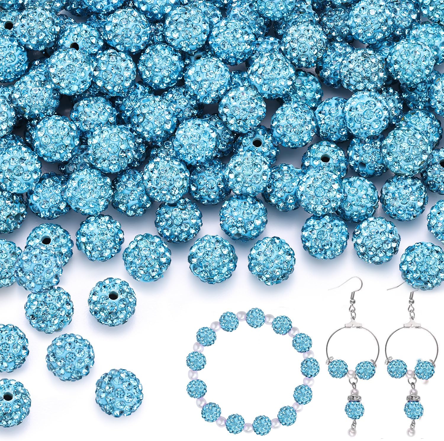 100 pcs 10mm Rhinestone Beads for Jewelry Making, Aquamarine Shiny Round Shamballa Disco Beads Bulk, Sparkle Crystal Clay Christmas for Bracelet Baseball Necklace Earring Crafting and DIY