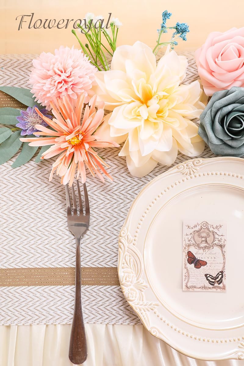 - ♔EASY TO DIY & CARE-Floweroyal fake flower is a box of pre-selected flowers by color, size and type. If you don't know how to make flower arrangements, we have picked out all the right kind of flowers for you to create. Our flexible plastic flower stems have built-in iron wires. It's very easy to stick in flower mud to arrangements or bend for DIY. Do not have to water and no dead leaves. Easy to clean and remove the dust. Not easy to fade. Easy to store for a long time and use repeatedly.