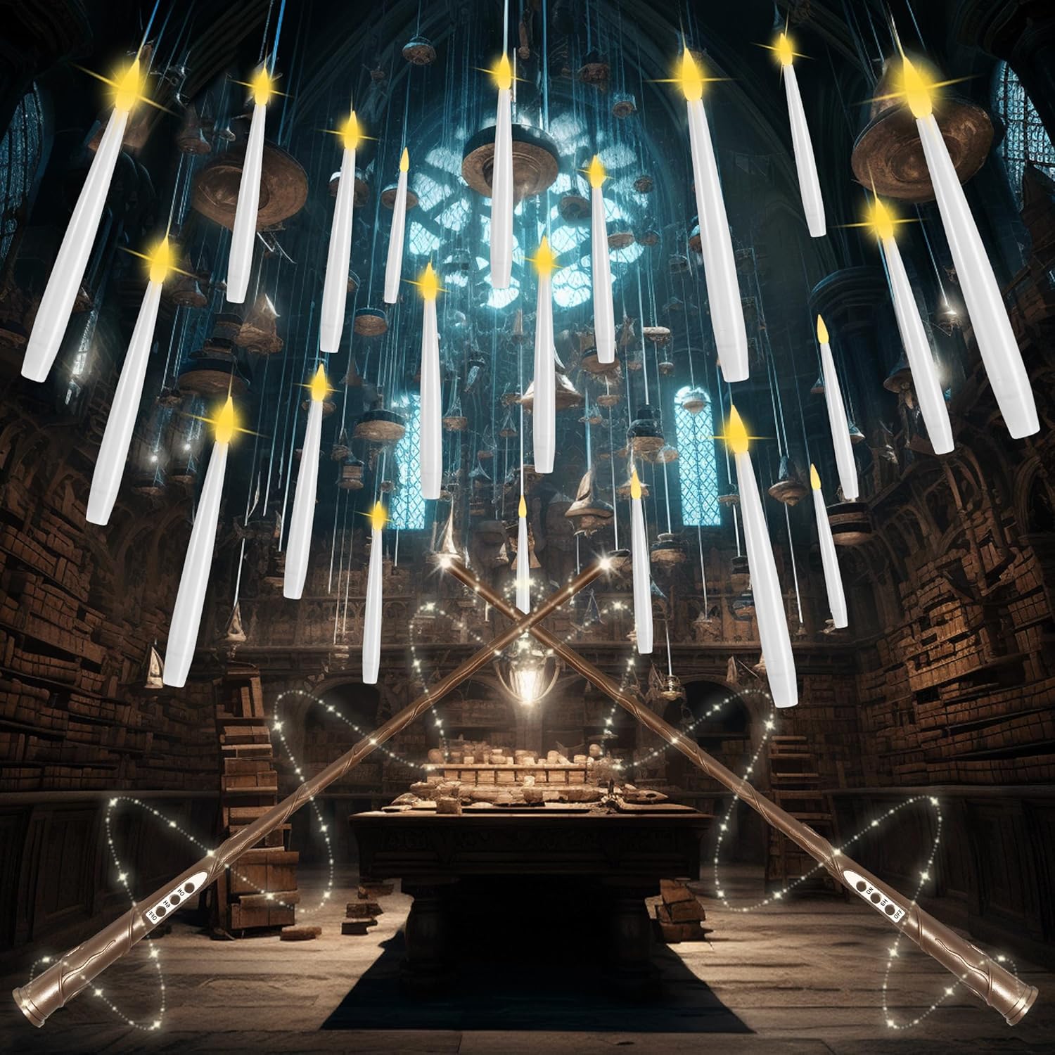 - LONG PRESS "ON" FOR 1-3 SECONDS FOR FLICKERING EFFECT🔮FLOATING CANDLES WITH WAND🔮 Start your magical journey with a cool magic wand remote! It can switch all the flickering flamless candles ON and OFF simultaneously just like magic. Your magic wand remote requires only 1x AAA battery before use(not included). By one click, you can magically light up your floating candles hanging in the air and long press ON, you can change the candles light to flicker effect just like real candles do.