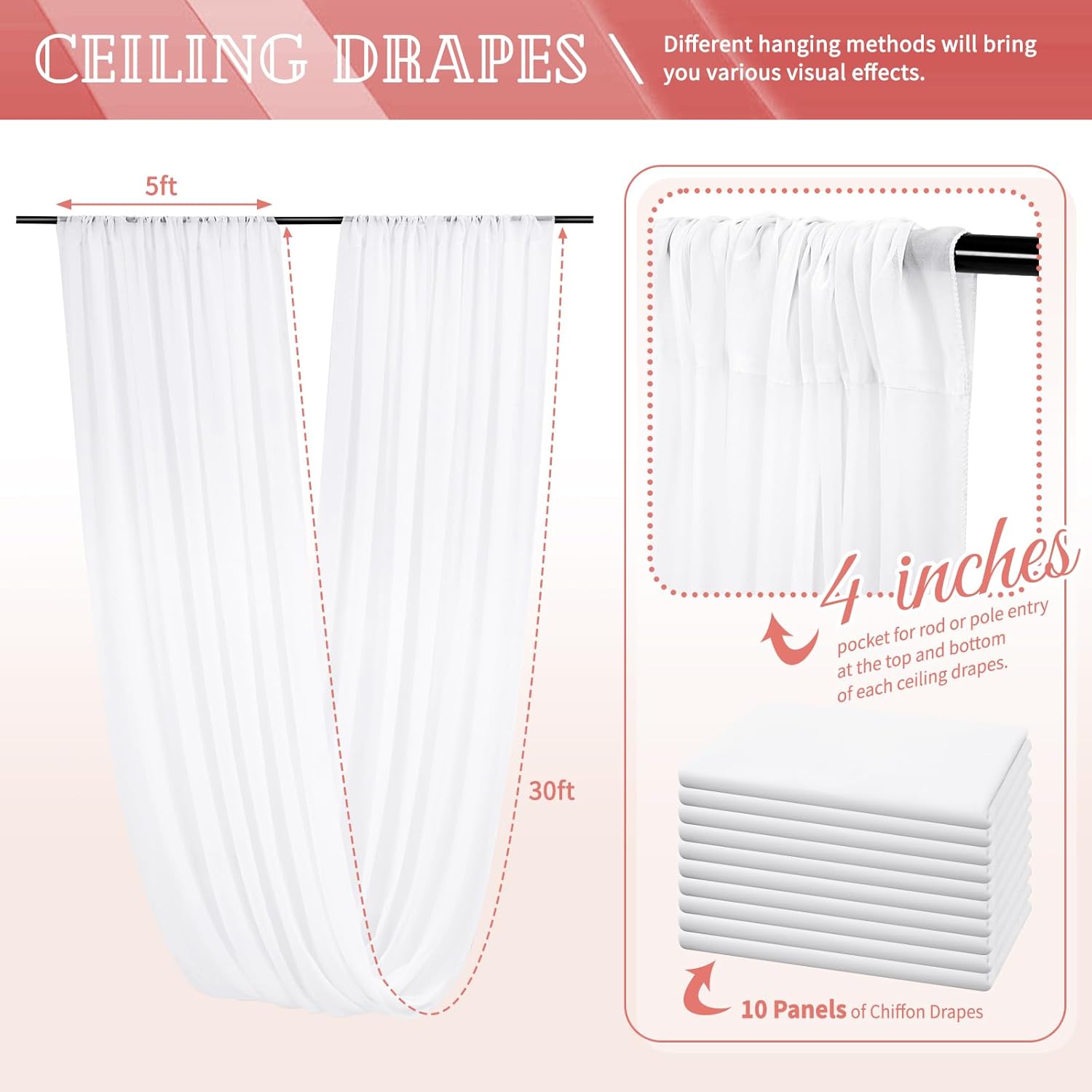 - 【Chiffon Fabric Curtain】The package will include 10 panels white wedding ceiling drapes (Not include stand !!!), each wedding extra long curtain measures 5 feet(60inch)wide x30 feet(360inch) long. Sufficient quantity can meet your needs. These arch draping are applicable for any indoor and outdoor occasion either for decorative or functional uses.