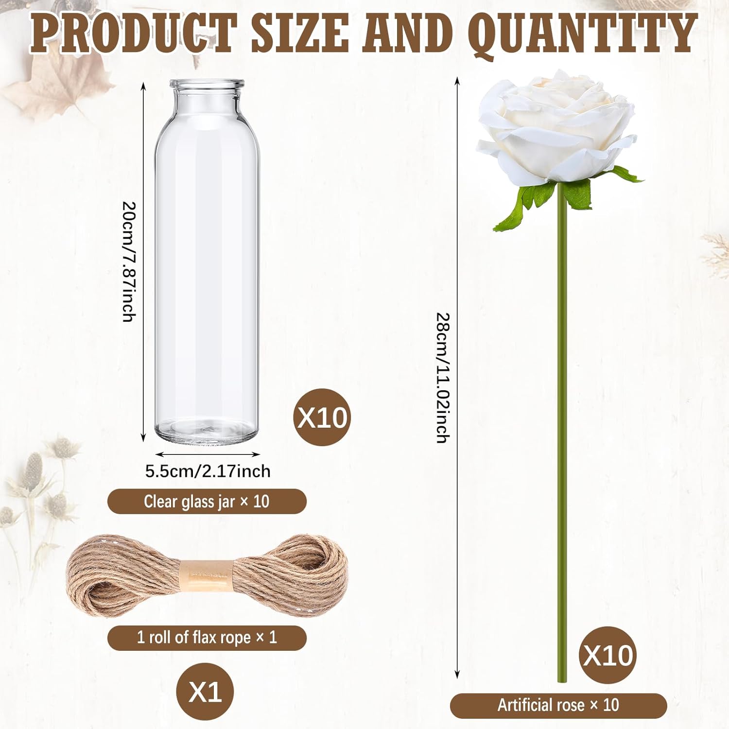- Detailed Size: our dried pampas grass measures about 16.93 inches/ 43 cm in average height, the artificial roses are about 11.02 inches/ 28 cm, the clear glass jars are about 2.17 x 7.87 inches/ 5.5 x 20 cm and the rope measures about 33 ft/ 10 m, well matching with each other, please check the size before ordering