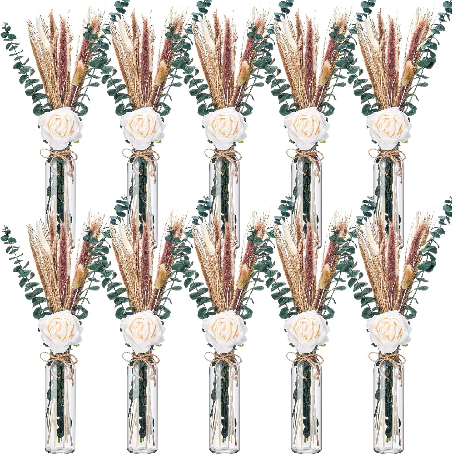 - Dried Pampas Grass Centerpiece: you will receive 80 dried pampas grass, including 30 small whisk dust grass, 10 white bunny tails grass, 10 primary bunny tails grass, 10 eucalyptus, 10 white reeds and 10 white pixie grass, and 10 artificial roses, 10 glass jars with 1 rope, rich in quantity and styles, meeting your various decorating needs