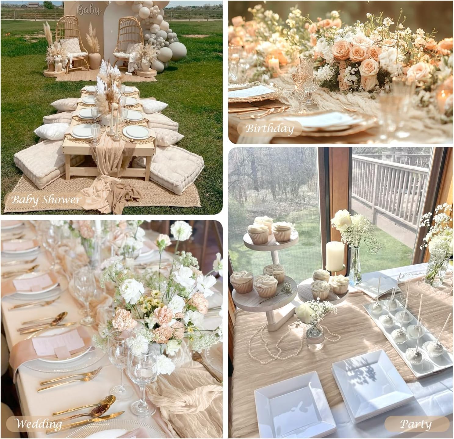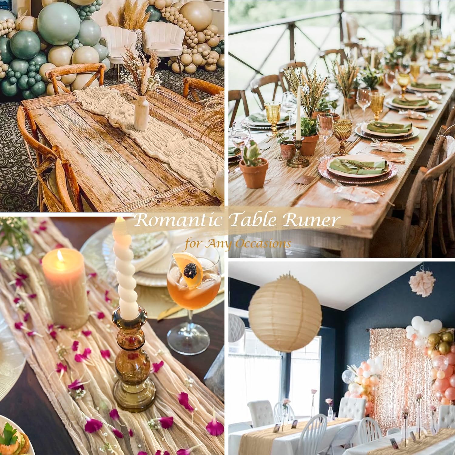- 🥂【Reusable & Soft】These romantic beige table runner is made of premium cheese gauze fabric with beautiful crinkling. Soft feeling, reusable, washable and fade resistant. These beige cheesecloth table runner adopt unique pleated workmanship, adding a touch of romantic and elegant to your events. The boho wedding table runner is sheer, natural drape, lightweight and skin-friendly. Soft table linen with gorgeous finished edges drapes gracefully across your banquet table, adds to romantic, delicate, and flowy vibe.
