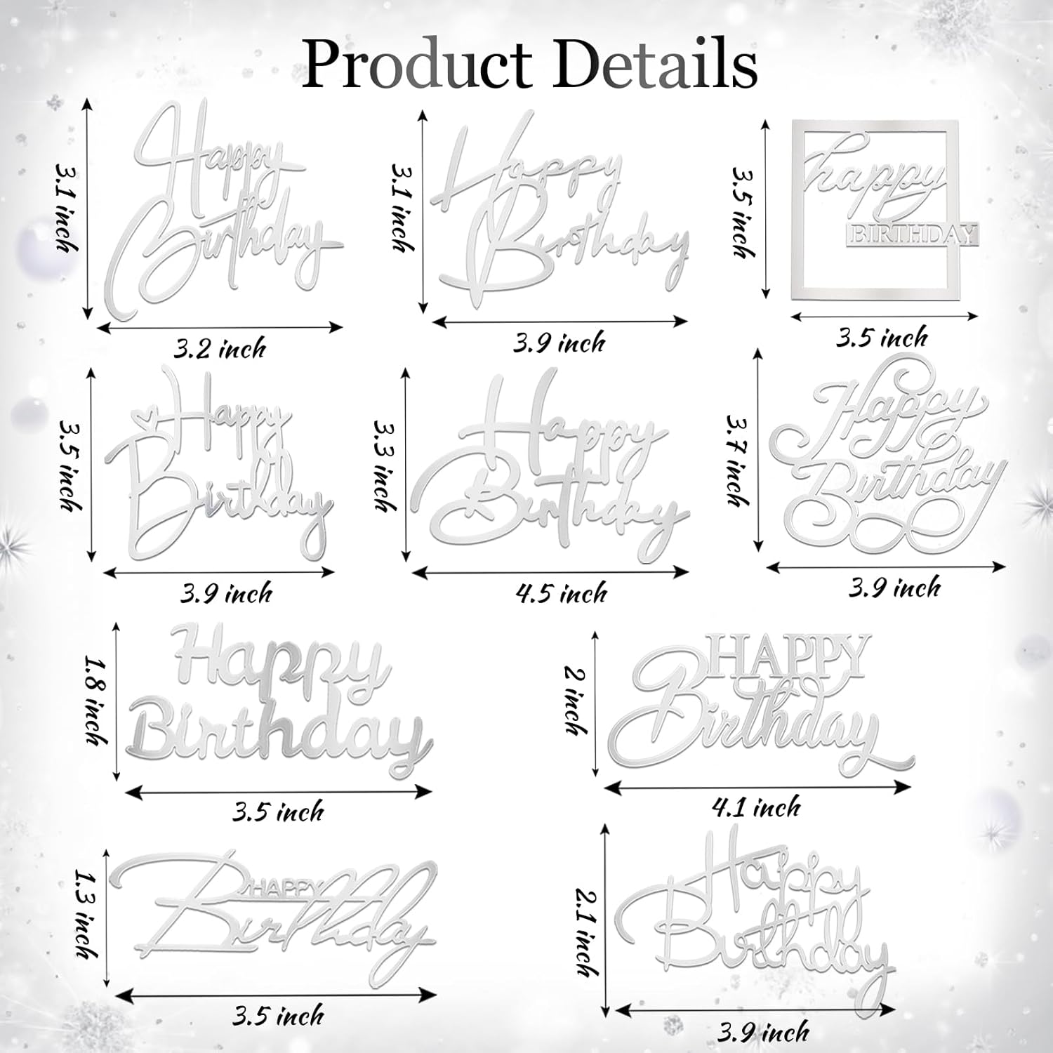 - Appropriate size: Double-sided mirror happy birthday cake topper is approx. 3.5 inch in width and the height is approx. 3 inch in height, suitable for most cakes.Tips:Our products have protective films on both sides. Please gently remove them to prevent the acrylic from breaking