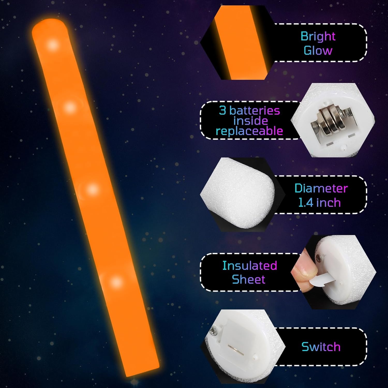 - Glow Foam Sticks Bulk:Our giant 30 piece orange foam glow sticks have vibrant colour, spice up your glow parties with these foam glow wands and decorations for background or use as giveaway toys. Great for raves, sports events, birthday, concerts, weddings, bars, carnivals, Christmas, New Year’s, the 4th of July, Halloween and more